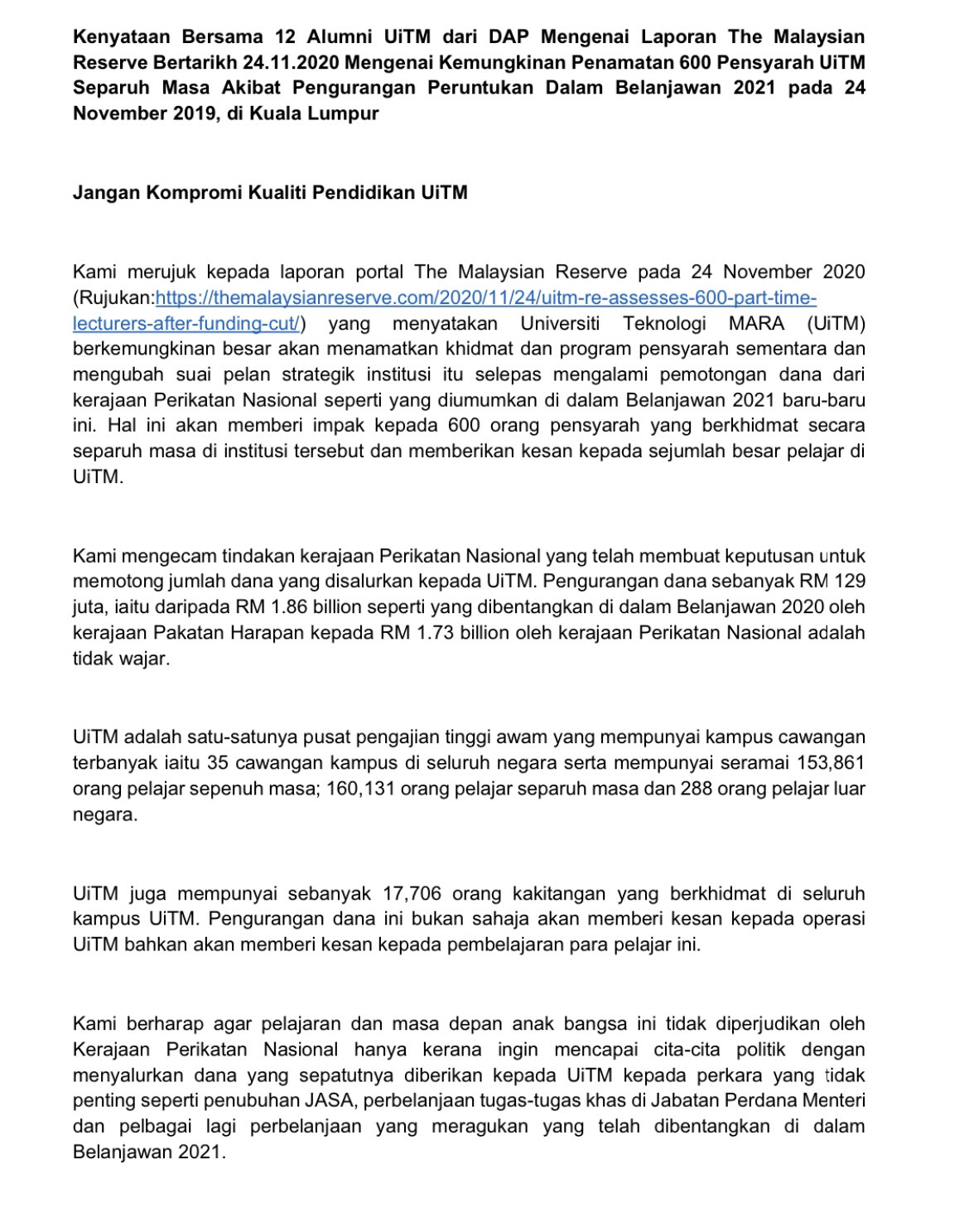 تويتر Syahredzan Johan على تويتر Just In 12 Alumni Uitm Yang Juga Merupakan Ahli Dan Pemimpin Akar Umbi Dapmalaysia Mengeluarkan Kenyataan Bersama Mengecam Pengurangan Peruntukan Mengurus Uitm Dan Kemungkinan Penamatan 600